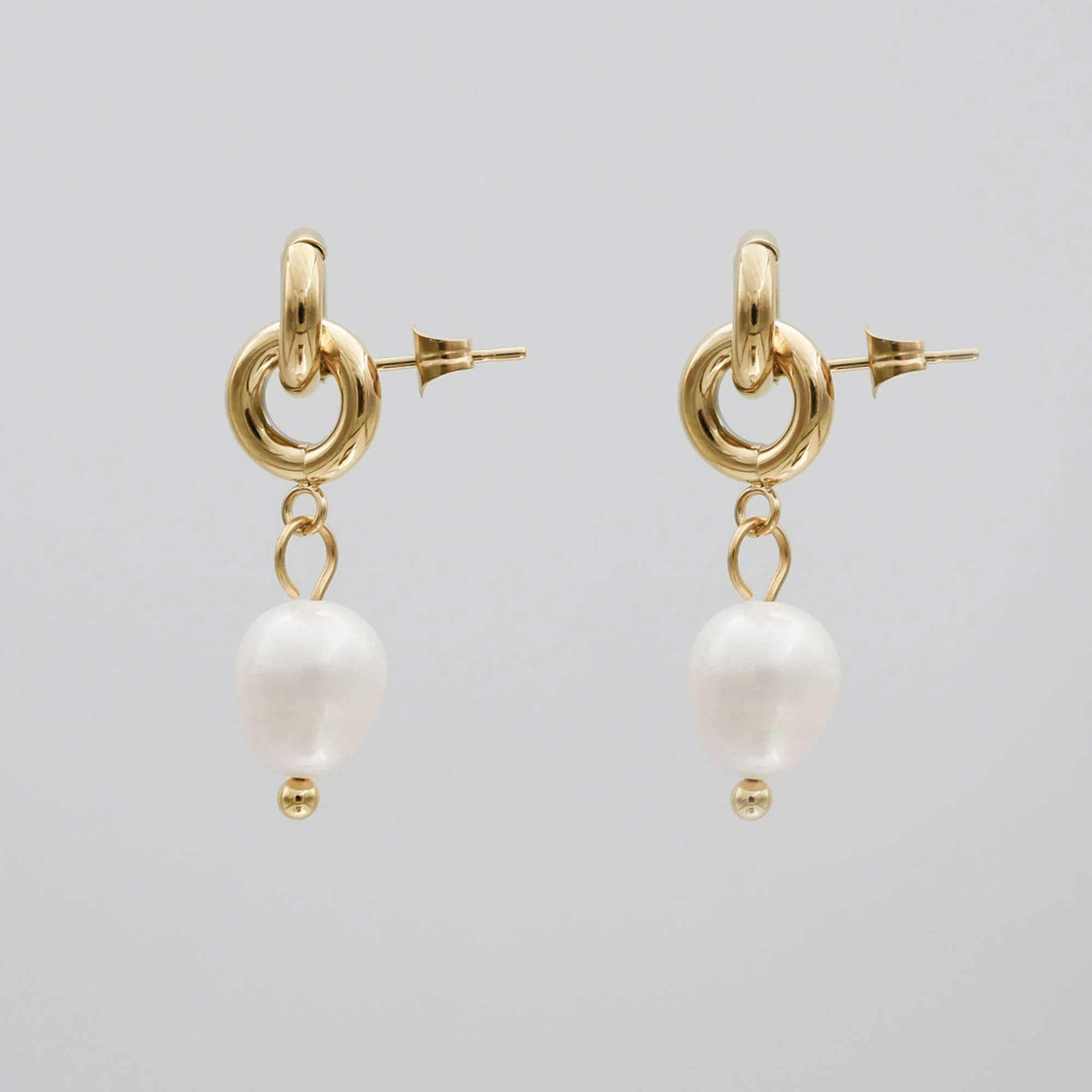 The Alicia Pearl Earringsare a rare blend of timeless elegance and modern design—a style that suits everyone and pairs effortlessly with everything. Featuring lustrous white pearls suspended from 18k gold-plated interlocking hoops, they offer a refined twist on the classic pearl earring.