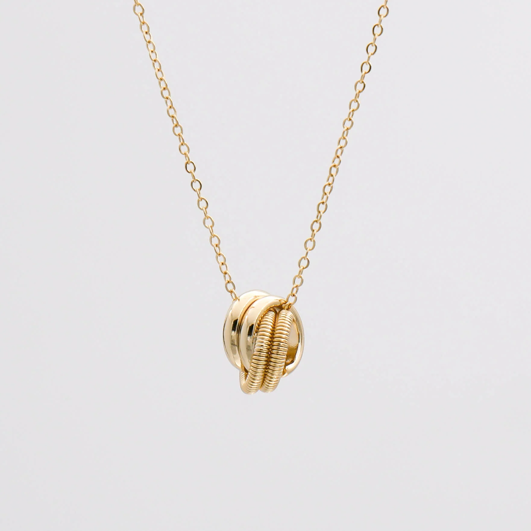 A symbol of an unbreakable bond that cannot be pulled apart. This divine gold knot charm sits beautifully on a delicate chain. The elegant charm is crafted into a dainty contrasting interlocking knot which moves freely along the chain.